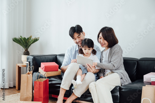 © JodieWang, Fototapeta premium Mom and Dad and daughter at home using a Tablet PC