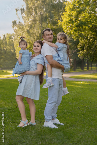© Татьяна Зернова, Obraz premium Mom and dad are standing back-to-back, holding their daughters in their arms. The family is dressed in blue, and everyone is looking at the camera. The concept of family, raising children, daughters,