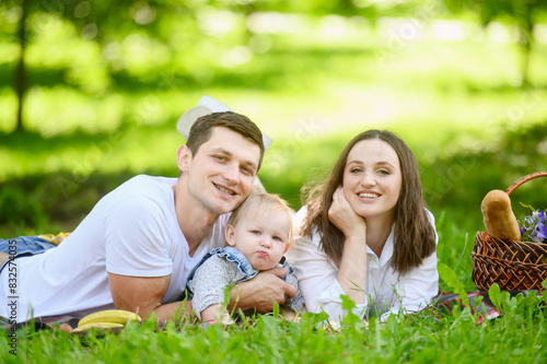 Fototapeta premium Mom and dad lie next to child on grass, smiling joyfully, enjoying sunny day together. Family love and spending time, enjoying nature. Concept for outdoor fun, family picnic