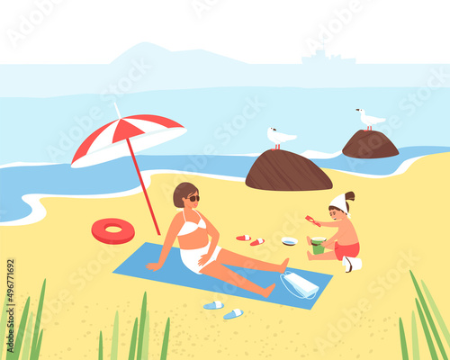 © Natali S, Fototapeta premium Mom and daughter are relaxing on the beach. A child plays with sea sand. A woman in glasses under a beach umbrella is relaxing on the beach. Sea gulls sit on the cobblestones. flat vector illustration