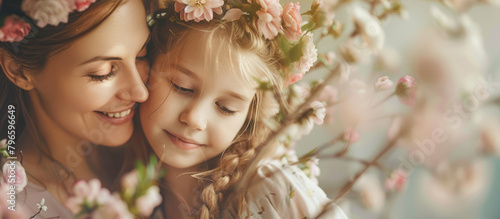 © ds17, Obraz premium Mom and daughter close-up against a background of flowering trees. Banner, place for text