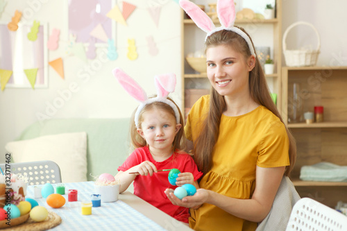 Fototapeta premium Mom and daughter paint Easter eggs for the holiday. Easter traditions.