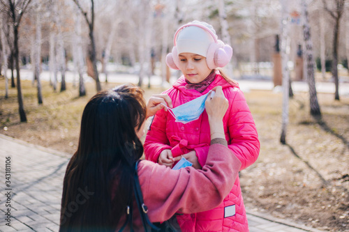 © Вероника Преображенс, Obraz premium Mom and daughter walk in the park during quarantine of the coronavirus. Child and parent in protective medical masks. Mom removes the mask from her daughter’s face. End of COVID-19 Pandemic