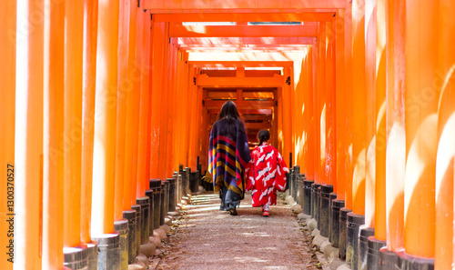 © Sean K, Fototapeta premium Mom and daughter walking under red gate in Kyoto