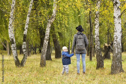 Fototapeta premium Mom and son are walking in the autumn forest. View from the back