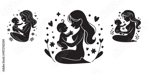 © rupon, Naklejka premium Mom and son, mother and son black silhouette