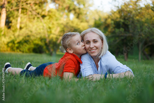 Fototapeta premium Mom and the boy are lying on the grass in the park.