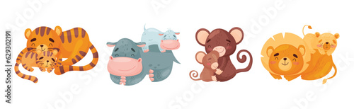 Obraz premium Mom Animal Cuddling with Its Little Cub as Parent Love and Care Vector Set