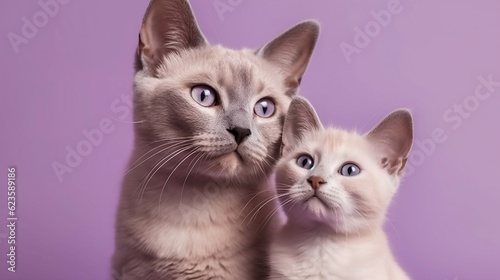 © Kateryna Kordubailo, Obraz premium Mom cat and baby kitten on light violet background. Generative AI