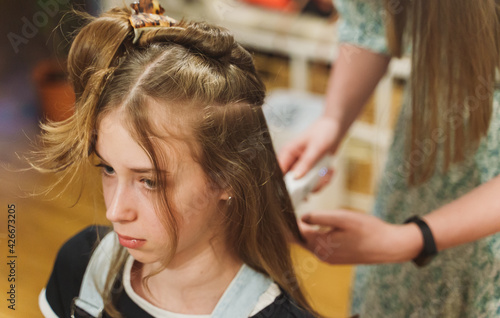 Fototapeta premium Mom cuts her daughter with a hair clipper at home.