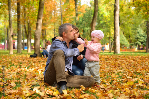 © Arestov Andrew, Fototapeta premium Mom, dad and daughter are playing on autumn leaves
