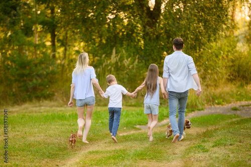 Fototapeta premium Mom, dad, boy, girl enjoying country vacation, holding hands, running...