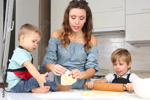 Fototapeta premium mom helps young sons knead the dough on the kitchen table