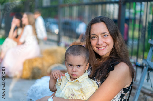 Obraz premium Mom holds a child in her arms. A happy family. Young mother holding her baby in her arms and stroked my mother's child litso. Portret mother and little son.