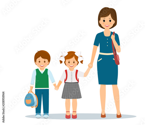 © romalya, Fototapeta premium Mom holds her children hand.Pupils go to school with mom.Isolated on white background. Cartoon style. Vector illustration