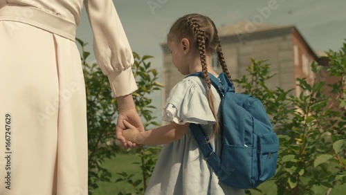 Fototapeta premium mom leads her little daughter with a backpack to school, escort child to preschool education, walk home through schoolyard, first grade student, happy family, kid with school bag by hand with mother.