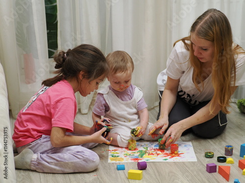 © Dilya, Fototapeta premium Mom plays with children, funny baby shows his palms painted with paint. Creative art classes. Laughter. Happy children and mom finger painting on paper at home. Bright colors, gouache and watercolors