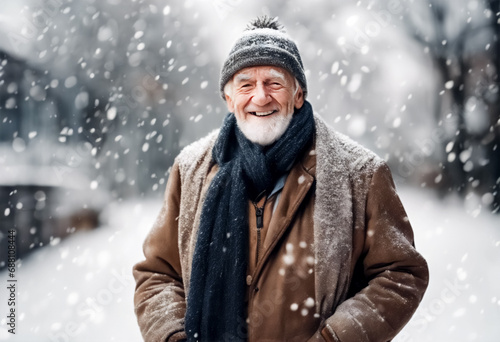 Obraz premium Momenti di Gioia- Uomo Anziano Sereno sotto la Neve