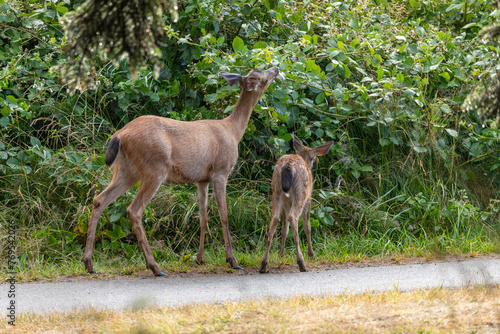 © Hrach, Fototapeta premium Momma deer spotted in Ecola State Park in Oregon Coast, early in the morning, walking with her baby