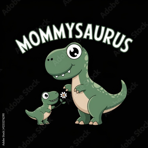 © tilialucida, Obraz premium MommySaurus with a cute dinosaur and its baby holding a flower