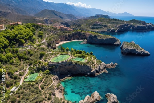 © Sci-Fi Agent, Fototapeta premium Monaco landscape. Aerial View of Tennis Courts on Coastal Cliffs Overlooking Turquoise Sea.