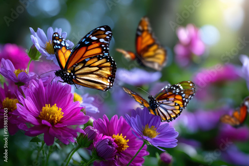 Fototapeta premium Monarch butterflies flutter among colorful flowers in a vibrant garden setting