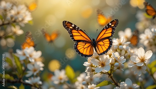 Fototapeta premium Monarch butterflies fluttering among delicate white blossoms in a sunlit...
