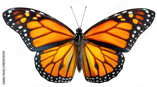 Fototapeta premium Monarch Butterfly: A captivating Monarch butterfly, its wings spread wide, showcases an intricate design of vibrant orange, black, and white patterns, a symbol of nature's artistry.