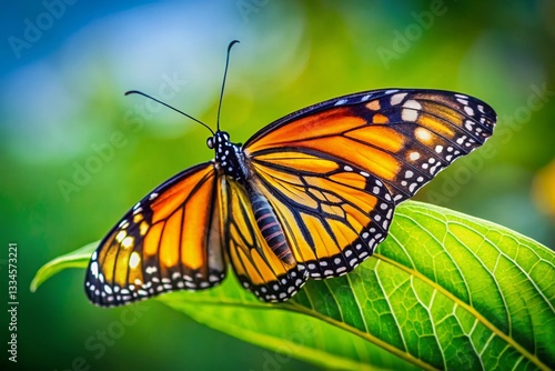 © Arnada, Fototapeta premium Monarch Butterfly Close-up on Green Leaf - Nature Stock Photo