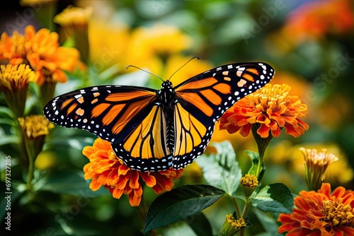 Naklejka premium Monarch butterfly Danaus plexippus feeding on a flower, AI Generated