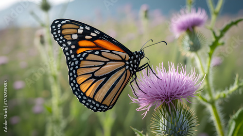 Naklejka premium Monarch butterfly drinking nectar from a thistle flower in summer meadow