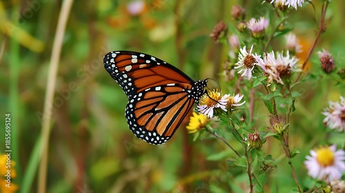 © Sharjeel, Fototapeta premium Monarch butterfly feeding on a pink aster flower in a natural garden setting