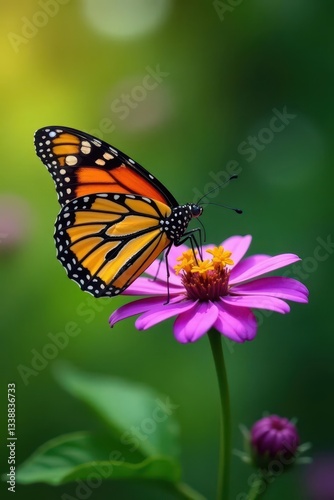 Fototapeta premium Monarch butterfly feeding on bright purple flower , bloom, nature photography