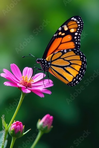 Fototapeta premium Monarch butterfly feeding on bright purple flower , color, wings, summer