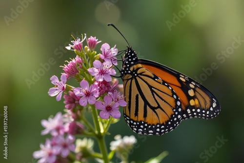© ABU, Fototapeta premium Monarch butterfly feeding on delicate pink flowers with a soft green background