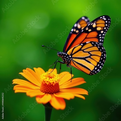 © nattapong, Fototapeta premium Monarch butterfly feeding on flower; green backdrop provides ample copy space , environment, butterfly photography