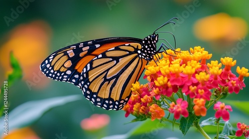 Fototapeta premium Monarch butterfly feeding on lantana flowers in a garden