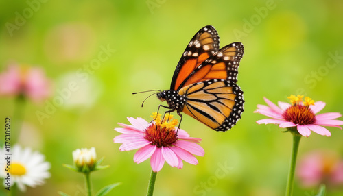 Fototapeta premium Monarch butterfly gracefully feeding on milkweed flowers in meadow, nature's...