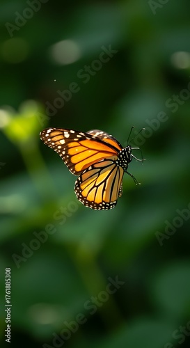© Edi, Obraz premium Monarch Butterfly in Flight Against a Soft Green Background.