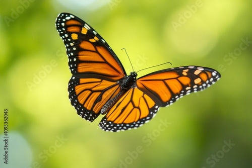 © Murda, Fototapeta premium Monarch butterfly in flight, green background.