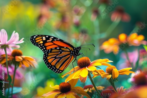 Fototapeta premium Monarch butterfly is enjoying the nectar of a bright yellow coneflower in a vibrant summer garden
