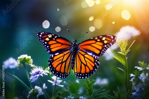 Fototapeta premium Monarch butterfly on a green meadow with flowers