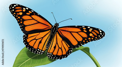 Naklejka premium Monarch Butterfly on a Leaf Against a Light Blue Sky Backdrop, wings outstretched