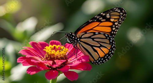 Fototapeta premium Monarch Butterfly on Flower: A vibrant monarch butterfly perches delicately...