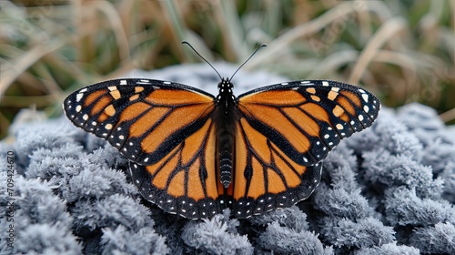 © Ross, Fototapeta premium Monarch Butterfly on Frosty Plant in Nature