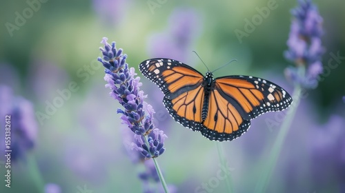 Fototapeta premium Monarch Butterfly on Lavender Plant in Soft Focus Background