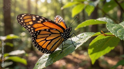 Obraz premium Monarch Butterfly on Leaf in Natural Habitat with Warm Soft Lighting for Conservation