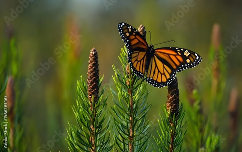 © Laily, Fototapeta premium Monarch Butterfly on Pine Tree Branch Closeup