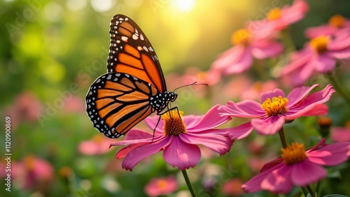Naklejka premium Monarch Butterfly on Pink Cosmos Flower Macro Shot, Spring Garden Beauty