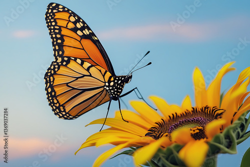 © Nayan, Fototapeta premium Monarch butterfly on sunflower beautiful nature photography stock image scenic wildlife orange insect wings summer